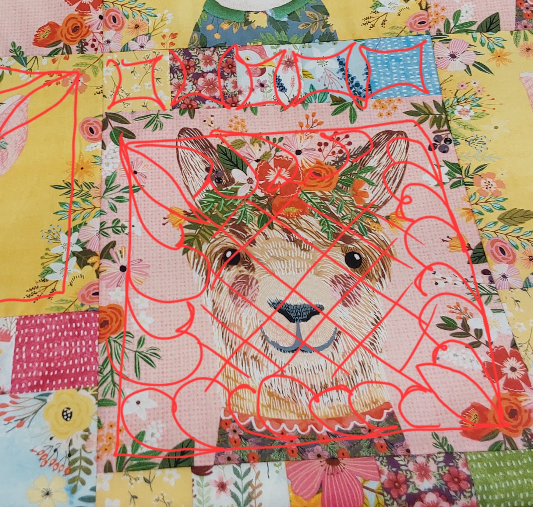 I don't love stitching on the faces of the animals but I thought that with a small enough cross-hatch, it would kinda disappear, I wanted to do more than just echo around the shape of the animals. So this is my idea.