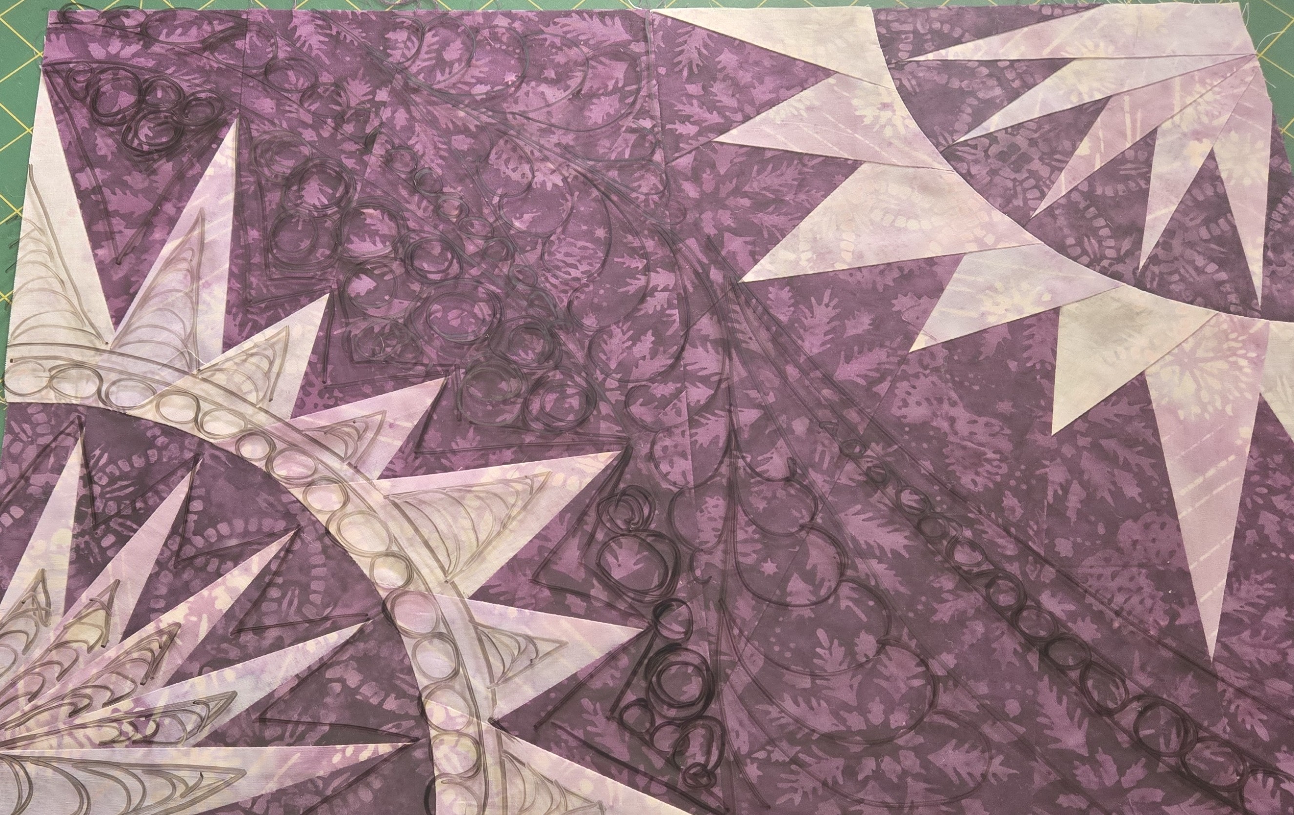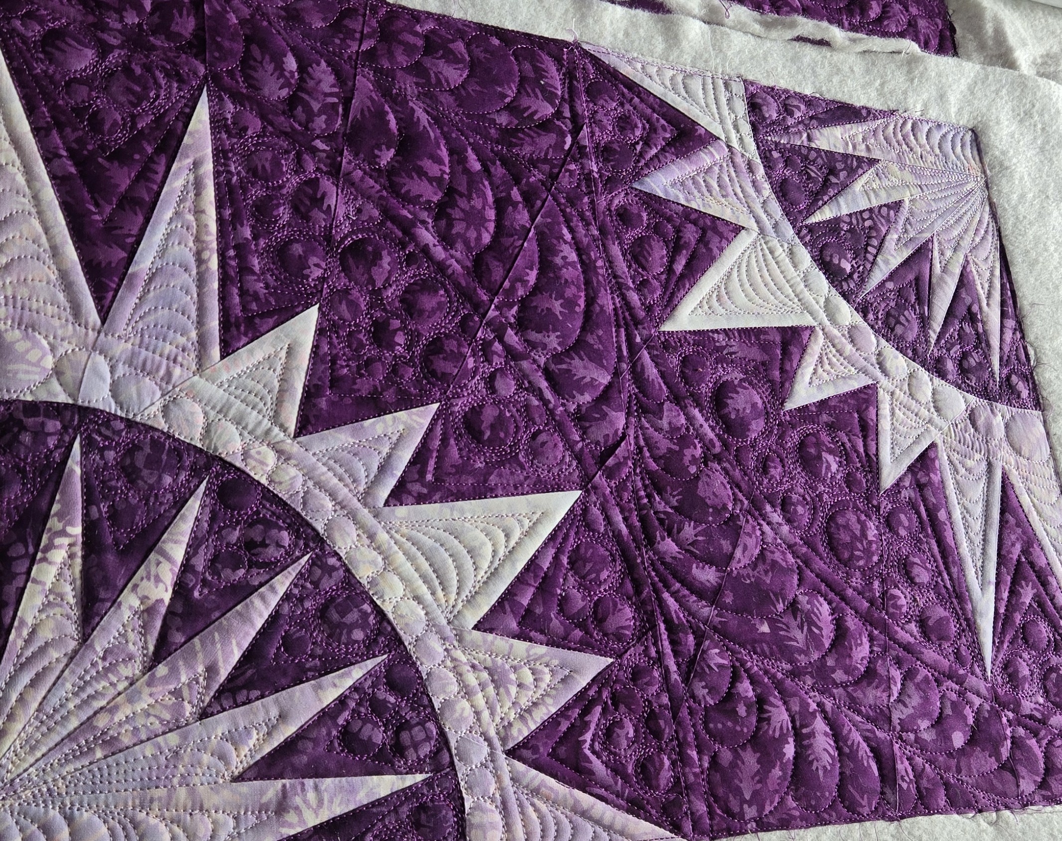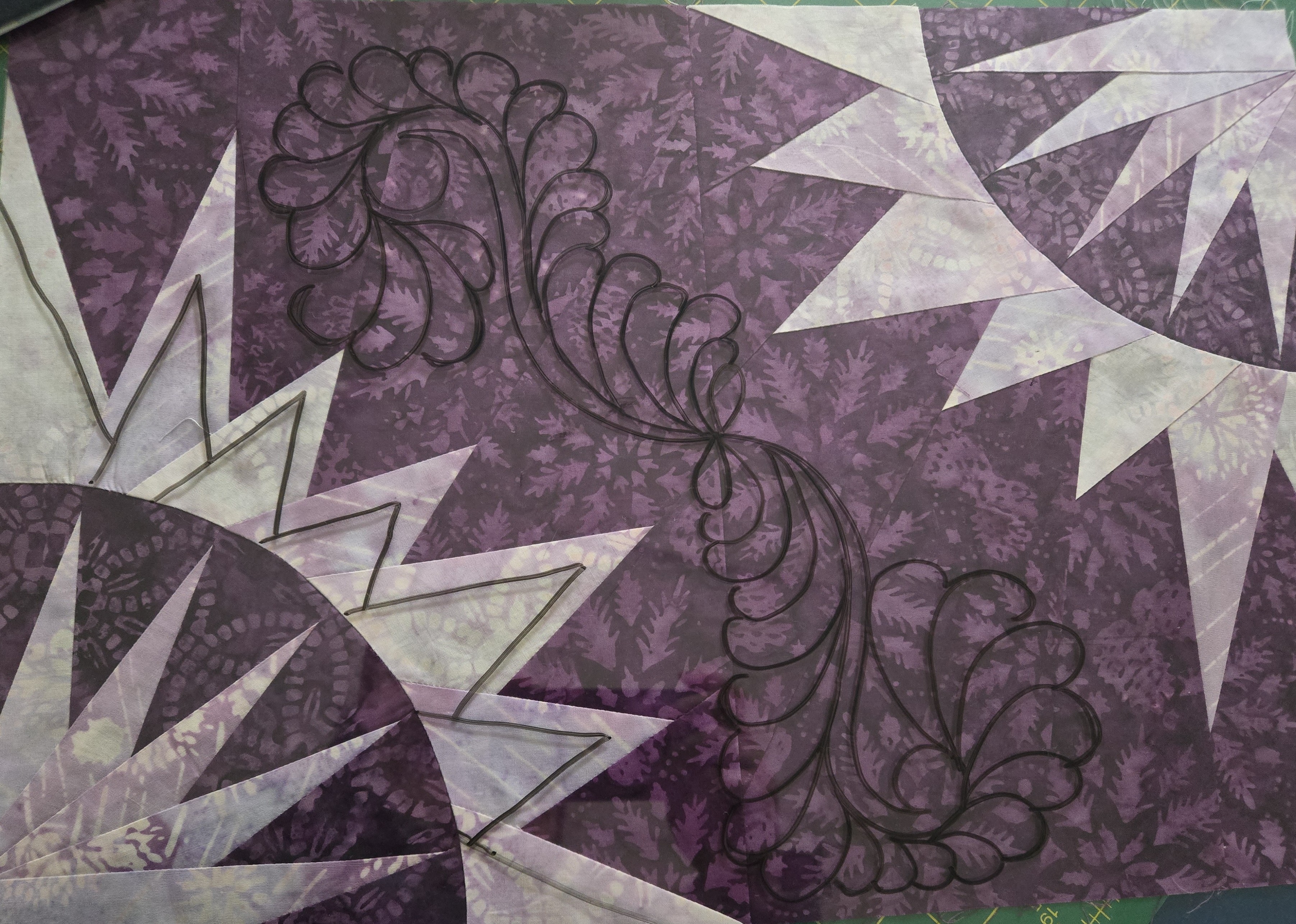 The only way to mount placemats on a longarm is if you mount them all using one backing (photo further down). When I was planning my design for these placemats, I knew I had to incorporate feathers somehow because Monette loves them. But these placemats were a little difficult to work on because they were made with very busy batik fabrics. Gorgeous but not always quilting friendly 🤣.